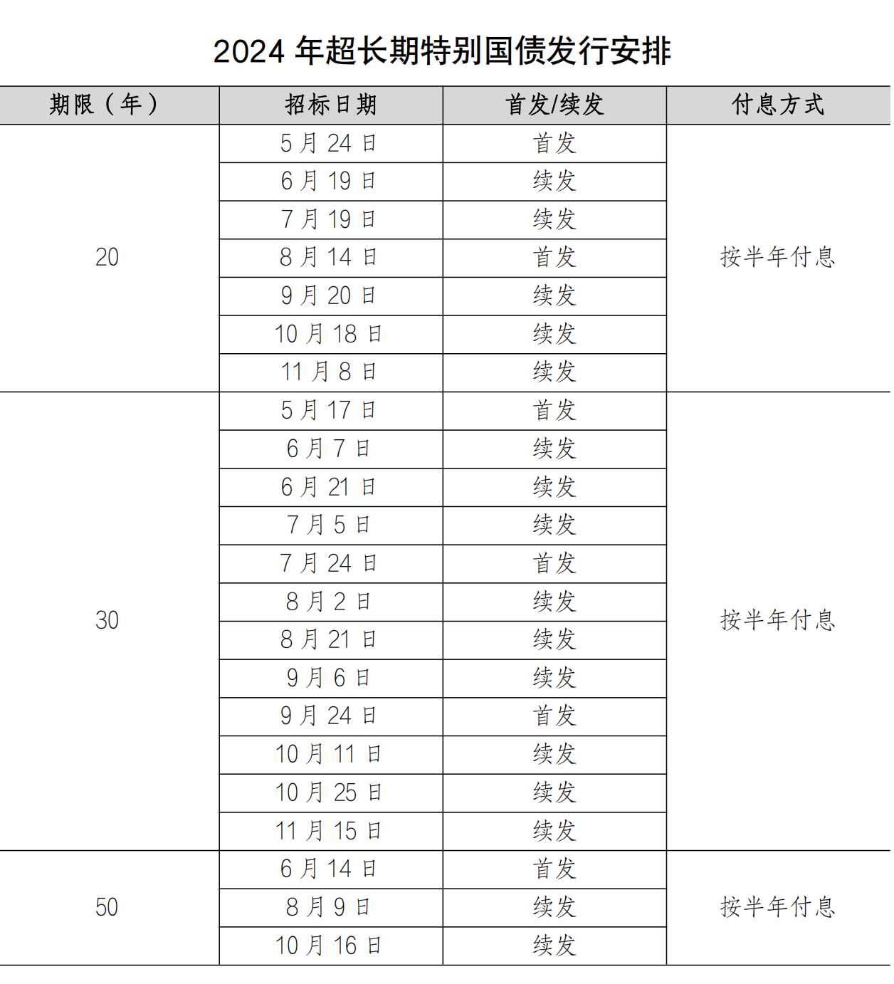 根据财政部公布的《2024年一般国债、超长期特别国债发行有关安排》,今年计划发行的1万亿元超长期特别国债分为20年、30年、50年三个品种。分析人士指出,与前五次特别国债相比,本轮超长期特别国债发行期限特别长。