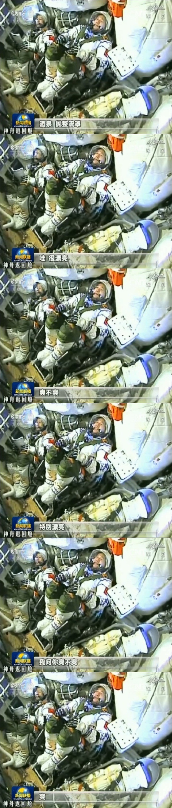 火箭升空后,整流罩打开时,第一次上太空的陈冬和三次上天的老船长景海鹏这样对话道: