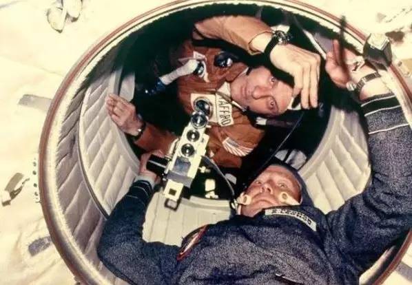 两人就这样干净利落地完成了这次历史性的握手,列昂诺夫太高兴了,他没有给其他宇航员给他们拍摄握手照片的机会。列昂诺夫握紧斯塔福德的手,一下子就把他拉到了「联盟-19号」飞船的舱内。列昂诺夫和斯塔福德头对头,拥抱在一起。