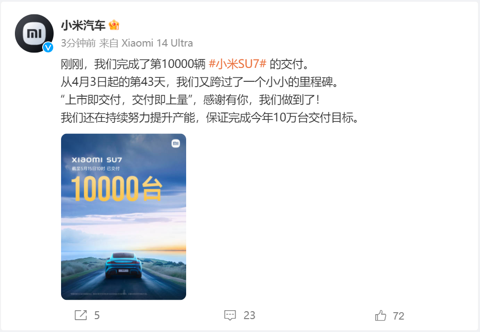 小米汽车5月15日在官博上称,公司完成第10000辆小米SU7的交付。