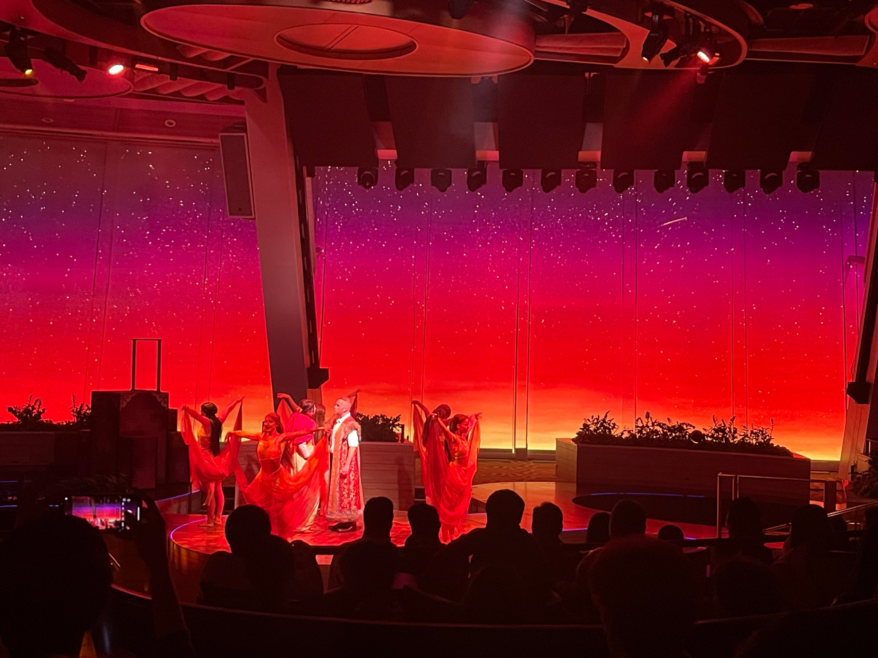 在文化娱乐方面,“海洋光谱号”提供了一系列精彩的晚间表演。从经典的《魅舞今夕》到充满异国情调的《丝绸之路》,再到融合现代科技的全新表演《光谱奇侠》,每一场表演都是对视觉和情感的双重盛宴。新加入的表演使用了最新的舞台技术,如高级投影和特效,增强了观众的沉浸感。