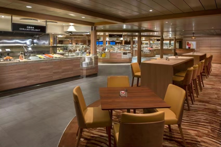 自助餐厅内部布局合理,有助于乘客流畅自如地选择各种菜式。即使在高峰时段,也不会感到过于拥挤。工作人员非常敬业和高效,他们持续监控各类食物的存量,并迅速补充任何即将耗尽的菜品,确保所有食物都是新鲜供应的。此外,餐厅提供多样化的菜品,从地方特色菜到国际美食,每种口味和饮食需求都得到了考虑和满足。如果半夜饿了,还有一家营业到凌晨2点的披萨餐厅(免费)可以饱腹。