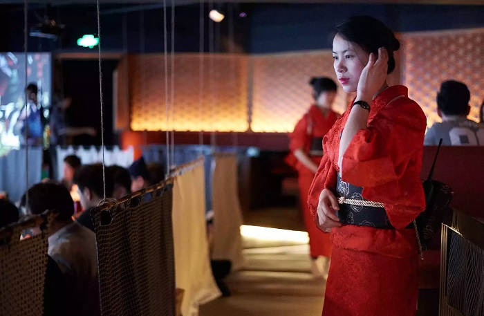可以自选喜欢的清酒、出甜品时会用上让人心情愉悦的橙味香氛、用餐结束时绑在食物托盘上的气球应景地摇晃,全场音乐、视频、带着一丝不苟的日式装扮的工作人员以及随处可见的和式细节都让整个场子氛围十足。知识性、娱乐性是它最大的亮点,大部分人也是秉着对“剧场”的好奇心而来。