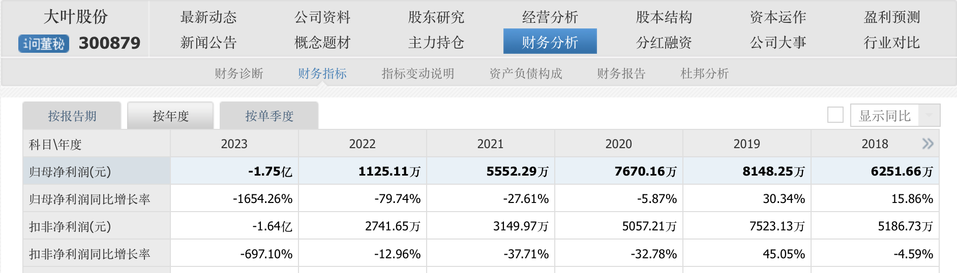 根据公开披露,大叶股份(300879.SZ)于4月23披露2023年年报,4月25日披露2024年一季报。数据显示,大叶股份2023年的营业收入9.28亿元,同比下滑36.91%,净利润-1.75亿元,由盈转亏;2024年一季度的营业收入和净利润分别为6.36亿元和4548.66万元,同比变动分别为48.81%和178.56%。