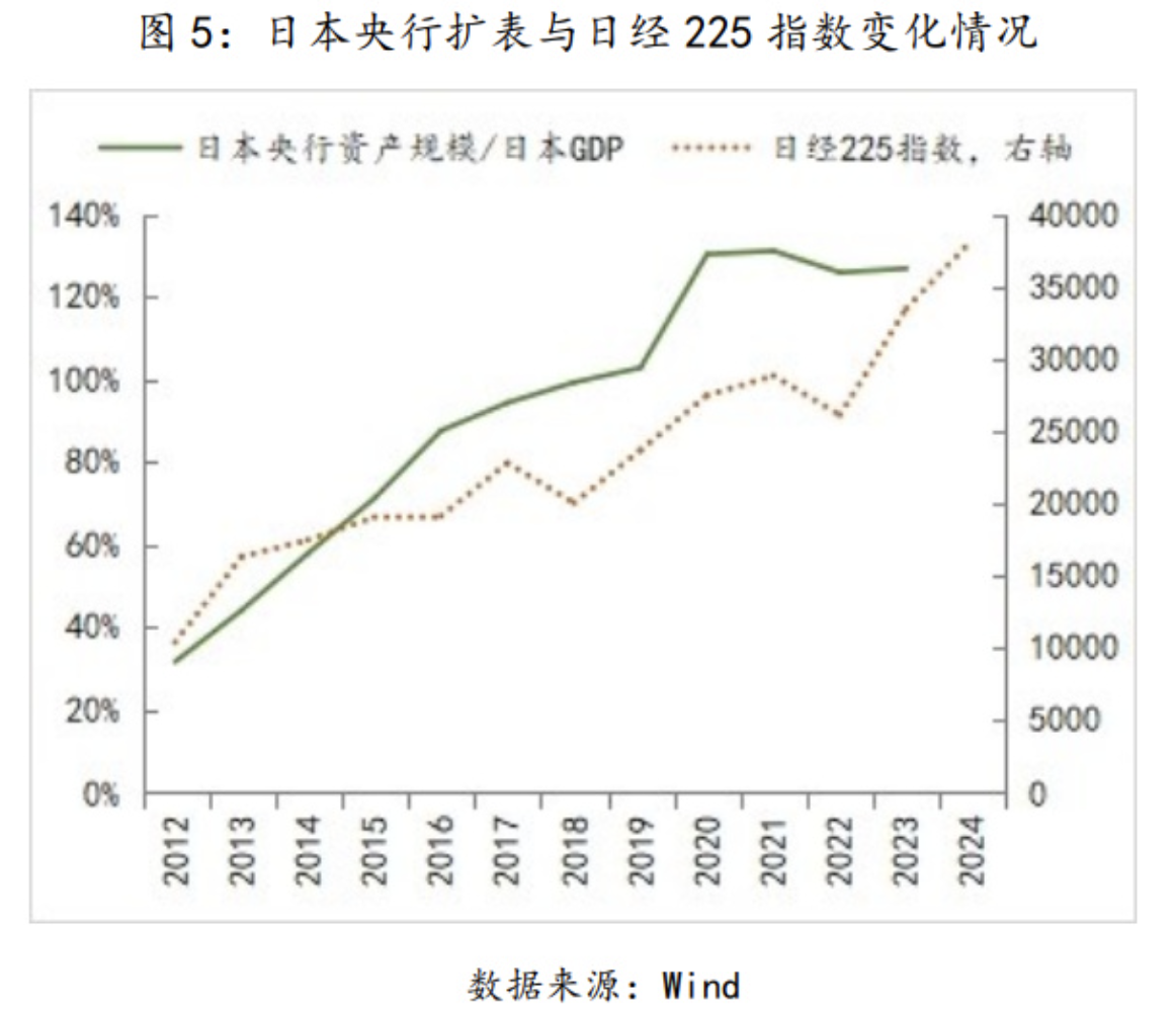 2012年,安倍晋三重返首相之位,令刺激有效需求改善通胀预期的总量政策回归宏观调控的首要位置,尤其是在货币政策方面,日本央行不仅明确了2%的通胀目标,而且时任日本央行行长的黑田东彦更是创新并坚决推进超宽松的货币政策,日本央行开始持续购买日本国债、交易型开放式指数基金(ETF)和房地产投资信托基金(REITs),日本央行资产规模占GDP比重开始快速上升,至2019年已经超过100%。在超宽松货币政策的推动下,日经225指数也同步持续回升,而资产价格率先走出通缩无疑是有助于改善居民实际收入和经济预期,也为之后日本物价的回升提供支撑。