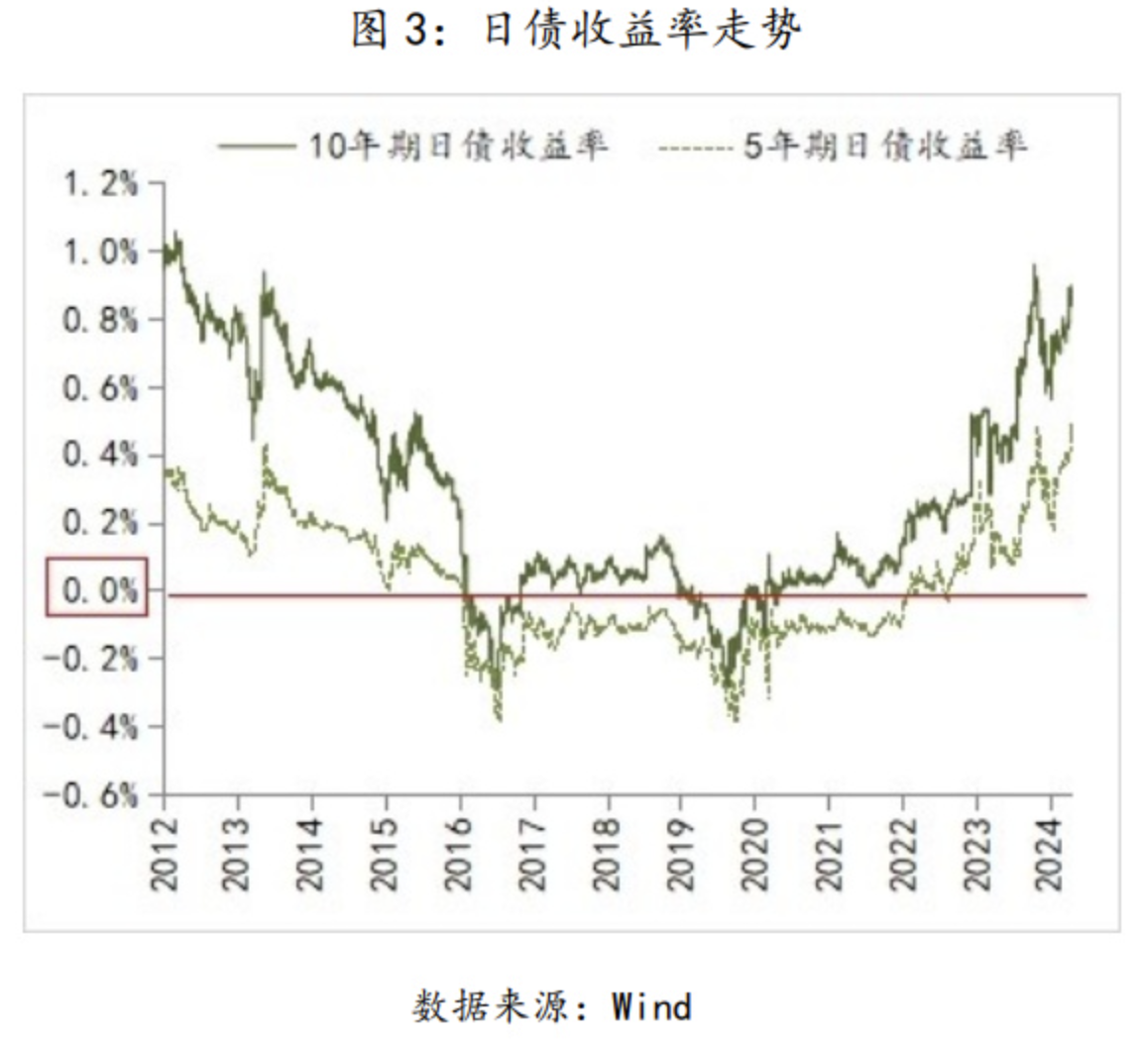 从逻辑上而言,伴随日本政策利率由负转正,日本国内市场利率理应跟随政策有所回升,且会带动日元汇率由弱转强。但是自3月19日日本央行退出负利率以来,日本国债收益率并未大幅超出负利率政策期间的高点,而美元兑日元汇价从150 的位置则进一步快速贬值,并于4月29日突破160整数关口,之后在日本政府的干预下才得以暂时稳住阵脚,但日元汇率能否一举扭转弱势尚不确定。