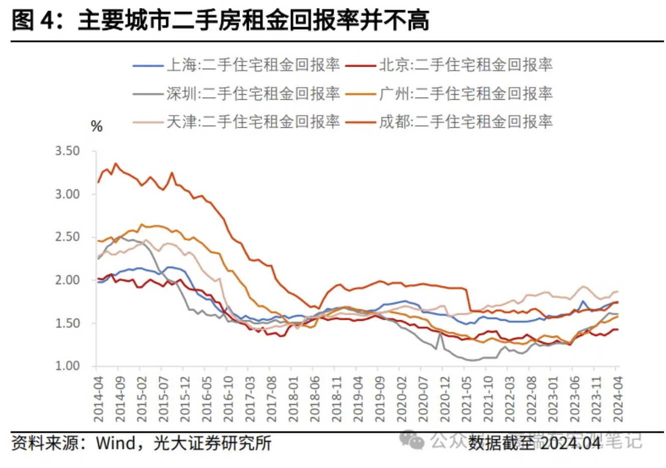 静态来看,主要一线和热门城市的租金回报率并不高,2024年4月份,上海、北京、深圳、广州、天津、成都的二手房租金回报率分布在[1.43%,1.75%],均值为1.66%。但这并没有考虑收储的“折扣”优惠,假设可以以7折进行收购,则租金回报率可以达到2.37%。扣除运营成本后,考虑到政策优惠类再贷款工具的利率较低且通常有财政贴息,那么依然存在一定的获利空间,从而激发地方主体行为。