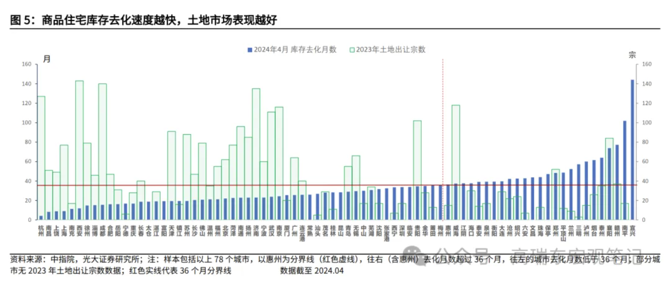 关注点三:“供给侧”去库存的另一层含义。2024年4月29日,自然资源部发布了《关于做好2024年住宅用地供应有关工作的通知》,要求商品住宅去化周期超过36个月的城市,应暂停新增商品住宅用地出让;去化周期在18个月(不含)-36个月之间的城市,要按照“盘活多少、供应多少”的原则,根据本年度内盘活的存量商品住宅用地面积(包括竣工和收回)动态确定其新出让的商品住宅用地面积上限。
