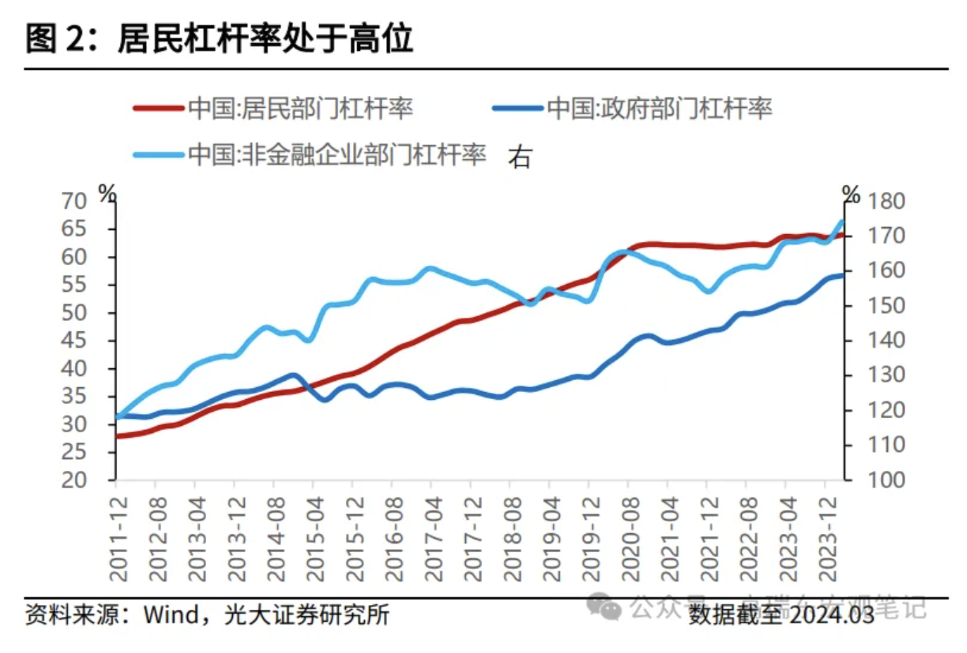 从细节来看,后续政策加码空间仍会有更多期待。其一,本轮去库压力相对更大。一方面,截至2024年4月,住宅类商品房待售面积接近3.91亿平,略低于上一轮的高点4.66亿平。但由于销售量急剧下滑,导致库存去化周期被动拉长。上一轮库存高点发生在2016年2月,库存去化周期为21.6个月左右,截至2024年3月,本轮库存去化周期已经攀升至22.4个月。另一方面,居民存量债务杠杆更高。2016年居民杠杆率季度均值为42.7%,而截至2024年一季度末,居民杠杆率已经攀升至64%,高出21.3个百分点。这意味着居民加杠杆的空间并不如2016年那一轮充足。对应地,则是需要来自政策端的更大力度地托底。