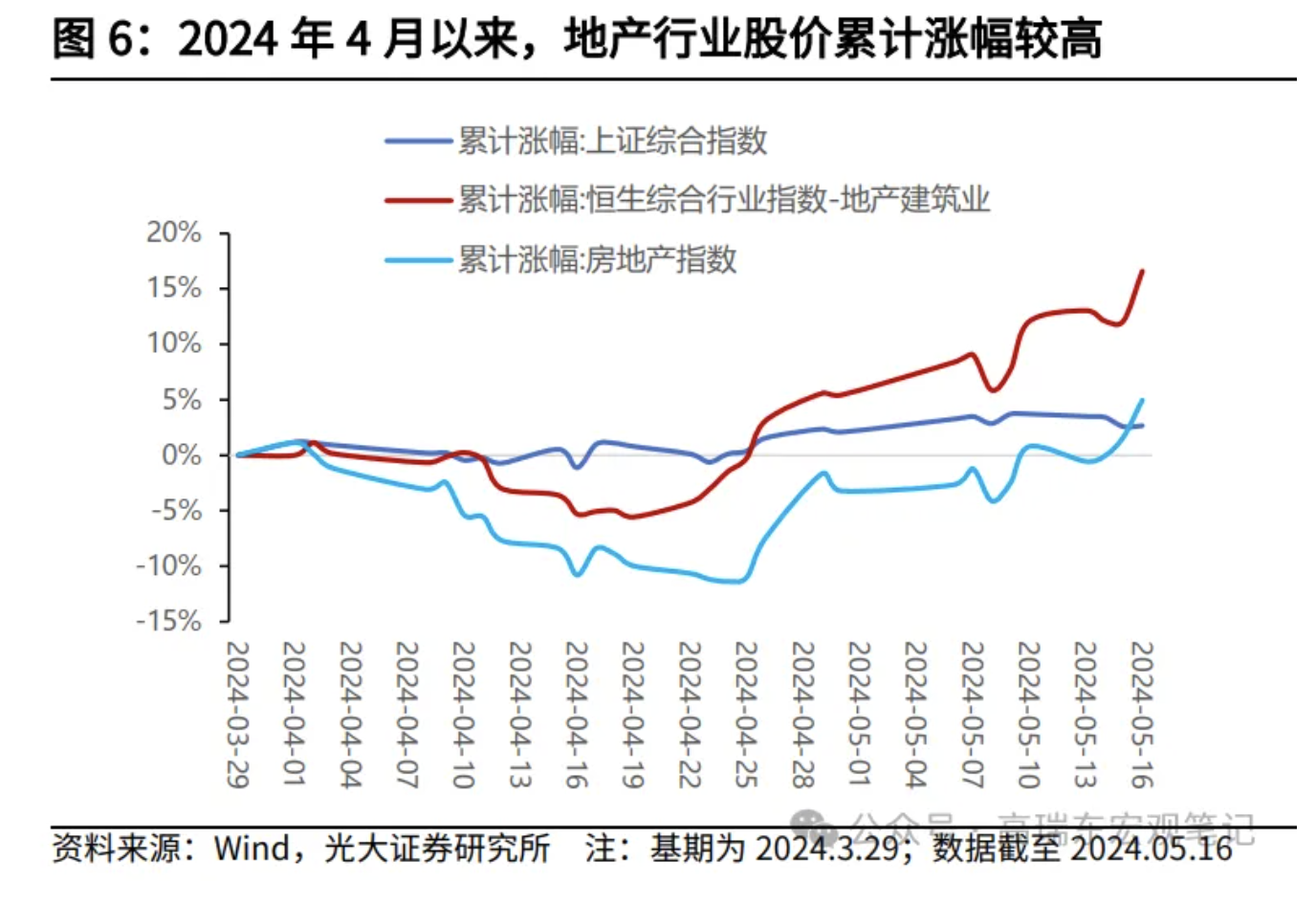 股债市场已经对政策的优化调整进行定价。随着地产政策逐步优化调整,资本市场对此反应较为积极。股票市场,4月份以来(基期为2024年3月29日,即当月最后一个交易日,截至2024年5月16日),上证综指累计上涨2.67%,房地产行业指数则获得超额收益,其中A股房地产指数累计上涨4.96%,恒生综合房地产建筑行业指数累计上涨16.58%。