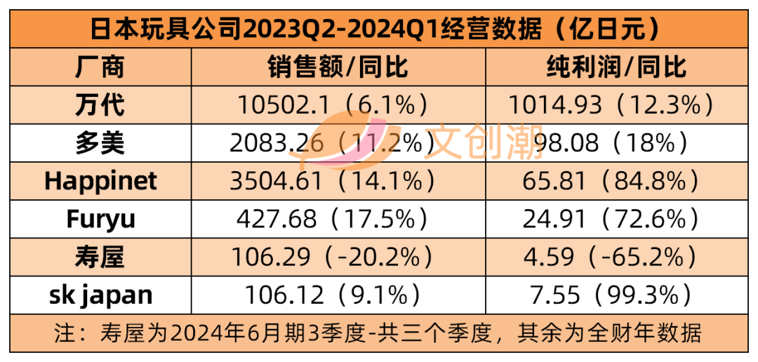 近日,万代南梦宫、多美、Happinet、Furyu、寿屋、SK Japan等几家主营业务含玩具的日本公司,先后披露了最新季度的财务营收数据。