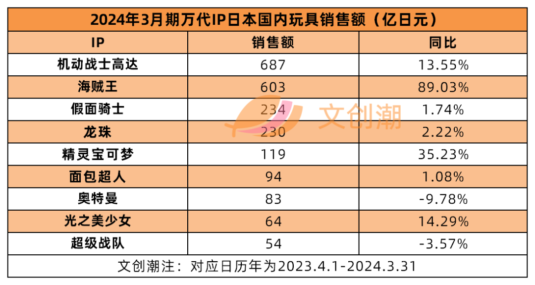 《机动战士高达》依旧稳居首位,销售额687亿日元,同比增长13.55%;