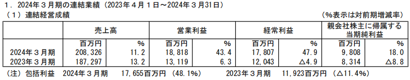 销售额2083.26亿日元,同比增长11.2%,纯利润98.08亿日元,同比增长18%。