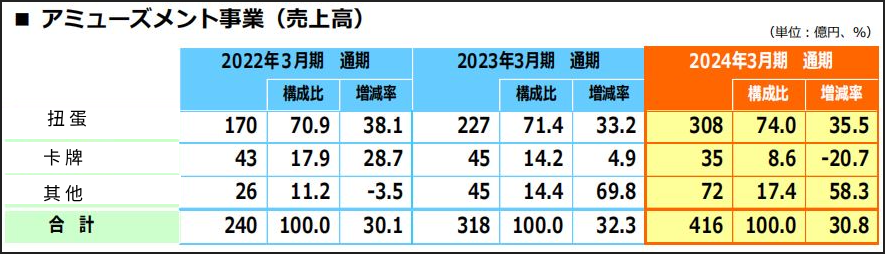 Happinet包括扭蛋、卡牌在内的娱乐事业,销售额416.43亿日元,同比增长30.8%,利润22.36亿日元,同比增长22.7%。