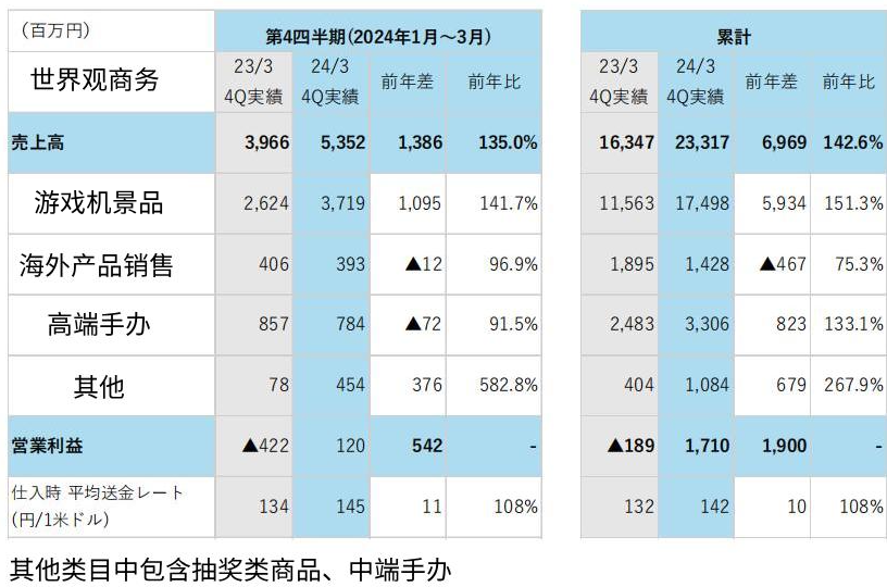 并且,截至3月,Furyu已连续16个月保持同比增长。世界观商务(原玩具事业)引领业绩增长,刷新年度最高销售历史记录。