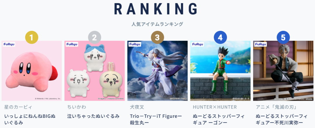 Furyu目前热销TOP5商品如上图所示,对应IP分别是《星之卡比》《吉伊卡哇》《犬夜叉》《全职猎人》《鬼灭之刃》,布偶和景品手办类商品最受欢迎。