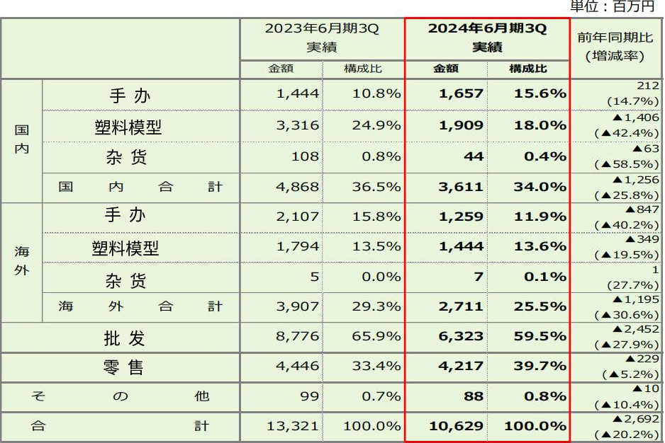 在日本本土,除手办外,其余品类均同比下降,降幅最大的是塑料模型,销售额19.09亿日元,同比下降42.4%。