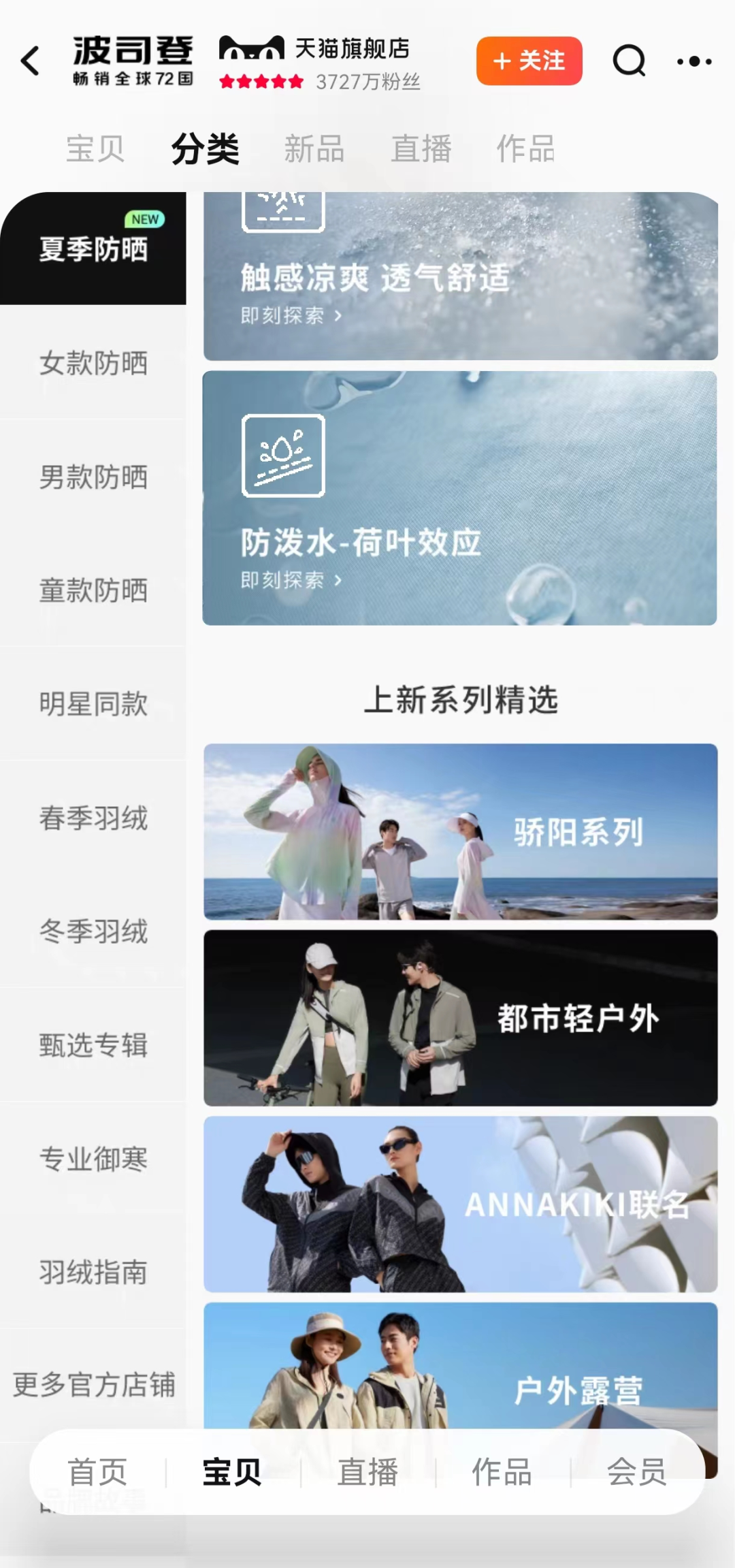 打开波司登官方旗舰店我们可以看到,其防晒产品在人群上做了细分,分为夏季防晒、女款防晒、男款防晒、童款防晒四大系列。在夏季防晒的上新系列中精选了骄阳系列、都市轻户外系列、ANNAKIKI联名系列、户外露营系列,推出了兼具科技感和外观的防晒产品。