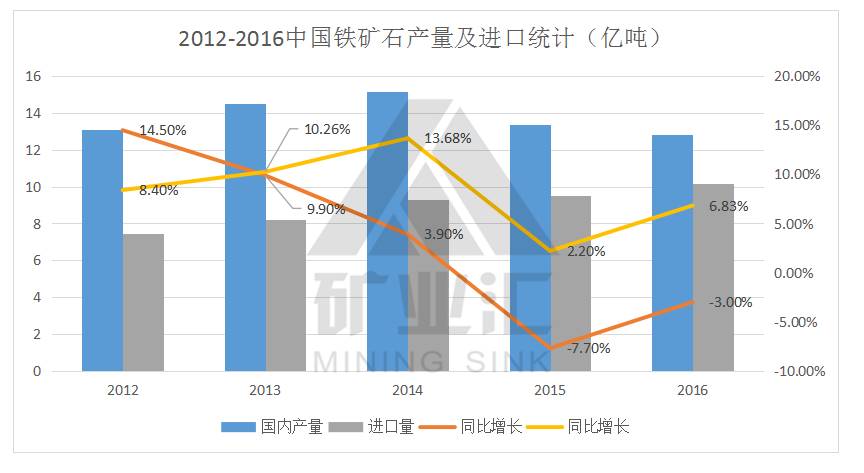 2016年,国内进口铁矿石首次破十亿吨,达到10.1779亿吨。从最近几年铁矿石产量及进口量来看,铁矿石进口总量增加,国内产量下降,国内中小型矿山的生存空间极其有限,外矿仍在不断挤压国内市场。