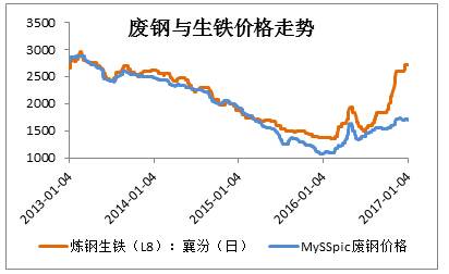 2016年,废钢与生铁价差从200元/吨,扩大到最高800元/吨,成本优势促使炼钢用废钢消耗量出现增加,同时全国范围内大量中频炉钢厂的停产,促使废钢资源流向发生一定的转变,废钢资源相对充足进一步促使了钢厂增加废钢使用的可能性。
