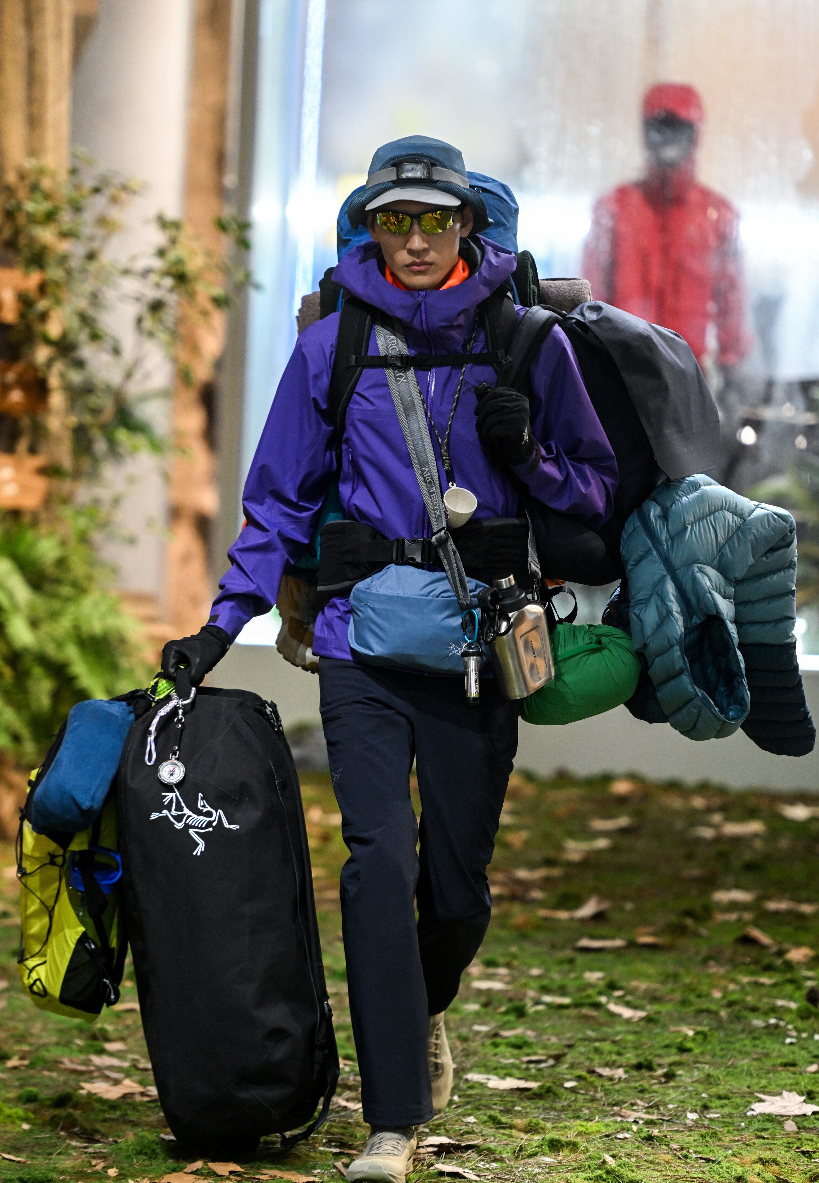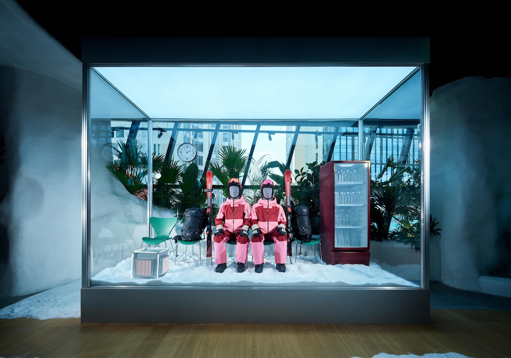 在5月18号举办的开业活动中,始祖鸟还通过5组艺术装置空间来展示外套及其他户外装备的功能性。比如,一组名为“丛林空间”的透明方形玻璃房子里,空间内被布置成有沙发的客厅,但人造的雨水却密集落下,沙发和地板生长着青苔和蕨类植物。一名身着始祖鸟硬壳外套的表演者捧着书,雨水打在外套上,发出噼里啪啦的声响,但外套里的衣物却是干燥的。通过这种展示,始祖鸟希望在突出硬壳外套功能性的同时,还能引发居住在城市的参观者对户外的向往。