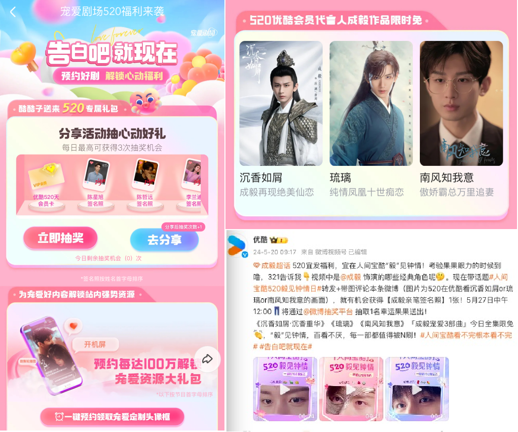 另一方面,以平台会员卡和热播剧的主演签名照作为抽奖福利推出“520专属礼包”,相关演员包括陈星旭、陈哲远、李兰迪等。值得一提的是,优酷在今年520专门为其最新会员代言人成毅设置了限免作品专区,集合了《沉香如屑》《琉璃》《南风知我意》等剧集;不仅如此,还为他在微博发起#人间宝酷520毅见钟情日# 话题和“成毅宠爱三部曲”视频物料,真是给足了代言人排面。