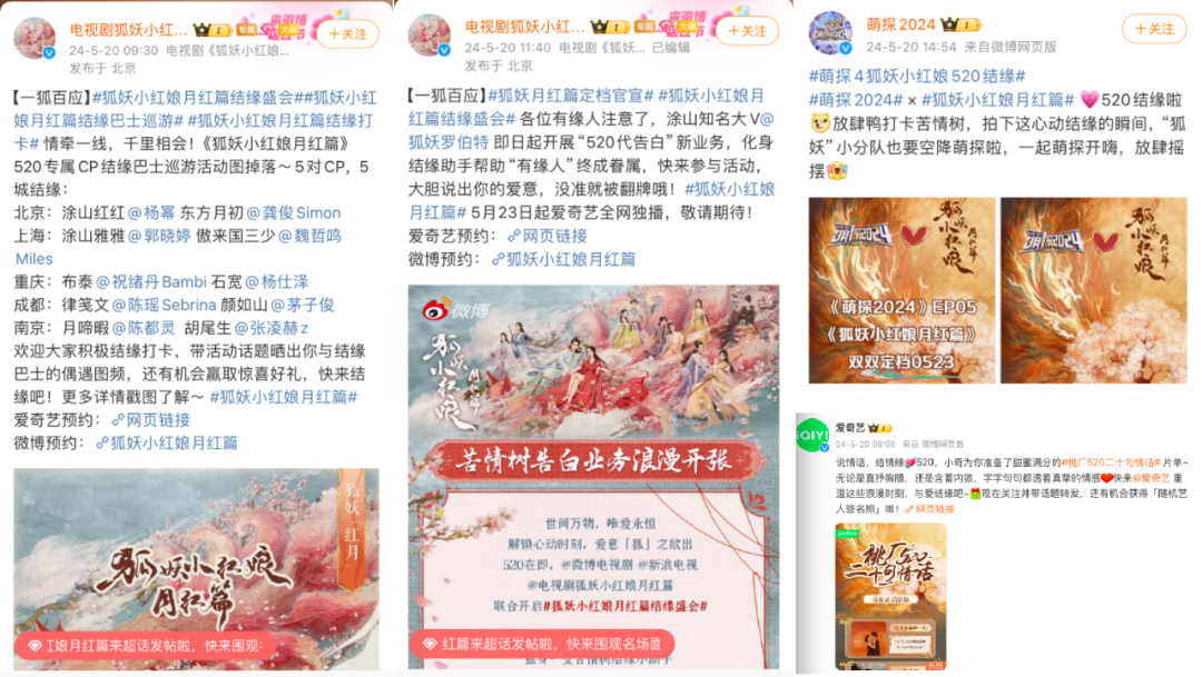 爱奇艺最大的“噱头”来自于《狐妖小红娘月红篇》的定档,该剧的520剧宣阵仗也令人侧目。在线下,一是与民政局联动,二是在北京、上海、重庆、成都、南京等城市开展520专属cp结缘巴士巡游活动等;在线上,剧集官微联合角色号发起“520代告白”业务,还与爱奇艺同日更新的王牌综艺《萌探2024》梦幻联动。