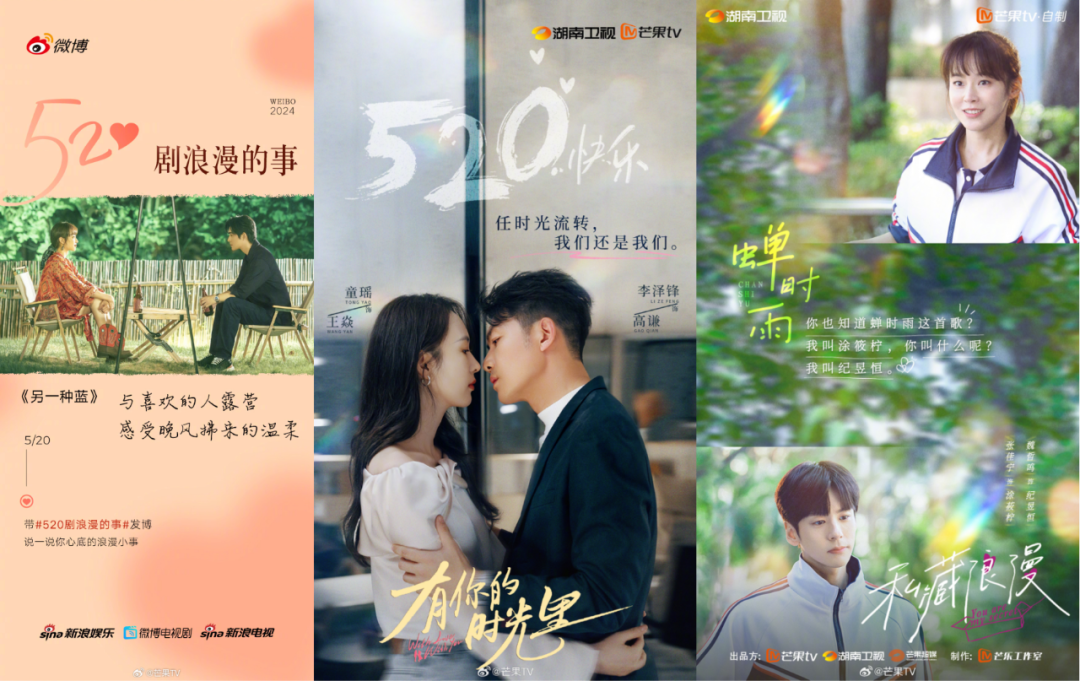 芒果方面的声量则相对较小,主要以湖南卫视和芒果TV官微发布相关剧集的宣发物料为主,仍在热播中的《另一种蓝》是宣传重点,先后发布了主题曲MV、剧中演员的520比心视频、最新剧照等物料。此外,张佳宁、魏哲鸣主演的《私藏浪漫》,童瑶、李泽锋主演的《有你的时光里》,景甜、张凌赫主演的《四海重明》等芒果新剧也相继放出了520专属海报。