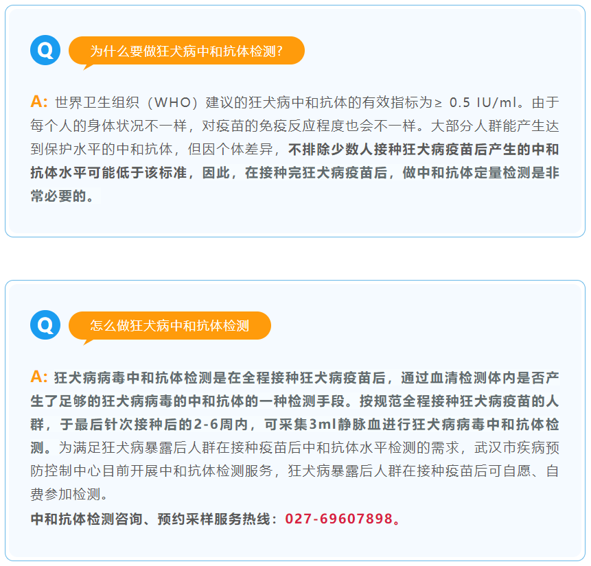 由于狂犬疫苗无法确保百分百产生抗体,阻断病毒感染,亦有机构推出狂犬病中和抗体检测。如2024年2月,武汉市疾控中心在其微信公众号发文称,“大部分人群能产生达到保护水平的中和抗体,但因个体差异,不排除少数人接种狂犬病疫苗后产生的中和抗体水平可能低于该标准,因此,在接种完狂犬病疫苗后,做中和抗体定量检测是非常必要的。”