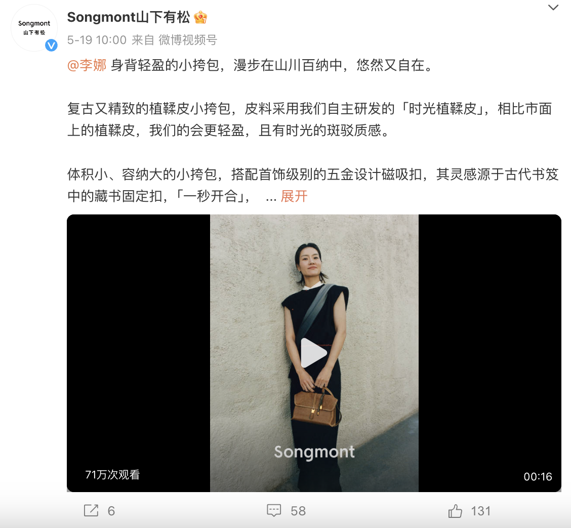 5月19日,本土小众包袋品牌山下有松Songmont官宣了一位新的品牌挚友,是网球运动员李娜。Songmont与李娜合作的广告片主要围绕自主研发的“时光植鞣皮”,以及新品循迹hobo包进行宣传。在Songmont淘宝店铺上,相关产品也标注了“李娜同款”。