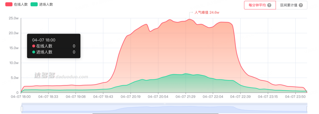 形成反差的是,4月7日晚间,董宇辉直播了两个小时,直播间人气峰值达到了25万,累计观看人次就超过了1100万,销售额为1000万-2500万元。