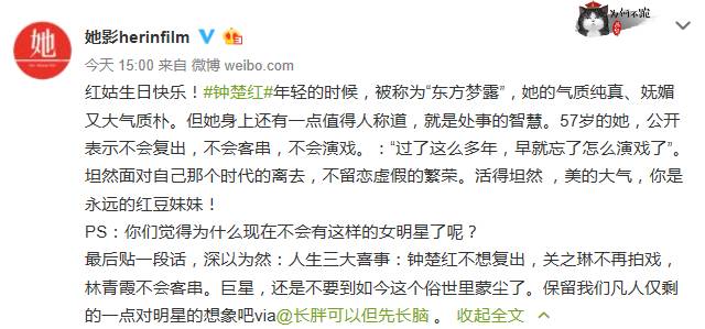 今天是一代巨星钟楚红57岁的生日,我非常喜欢她,中午就在官微暗搓搓发了祝贺她生日快乐的微博。