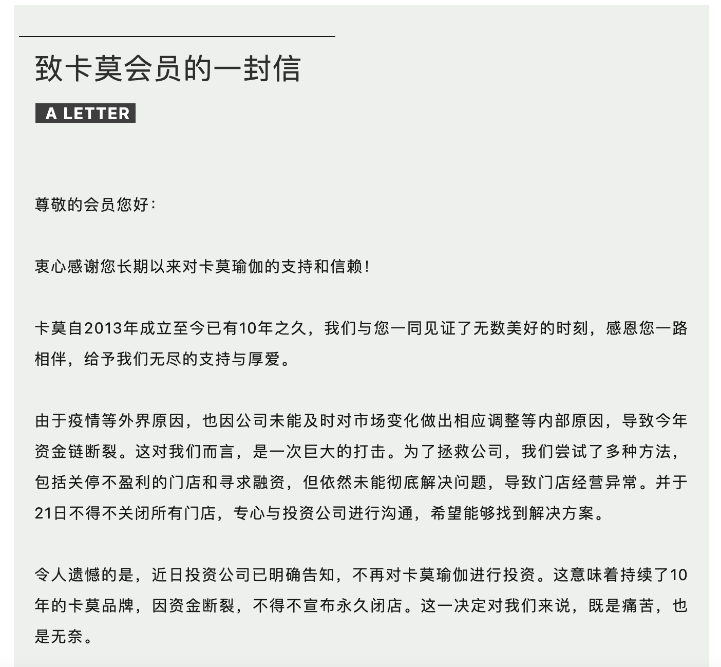 这家公司称,为了拯救公司,已尝试了多种方法,包括关停不盈利的门店和寻求融资,但依然未能彻底解决问题,导致门店经营异常。并于21日不得不关闭所有门店,专心与投资公司进行沟通,希望能够找到解决方案。但在沟通之后,近日投资公司已明确告知,不再对卡莫瑜伽进行投资,因此不得不宣布永久闭店。