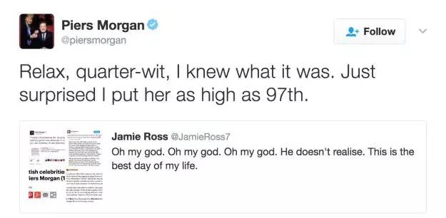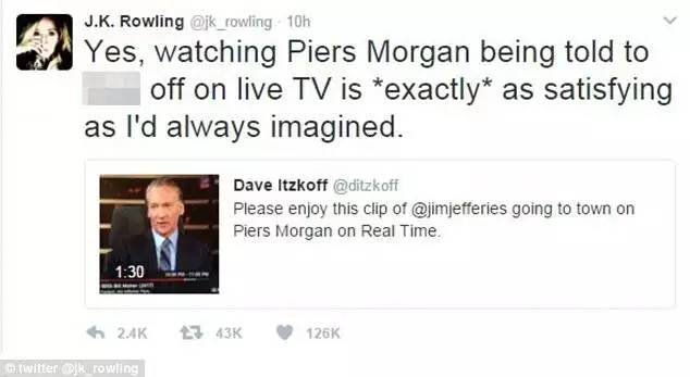 节目播出后第二天,罗琳挑起战事,她发推文说,“看到摩根在电视上被问候去你×的,身心舒畅。”她的推特上有九百万粉丝。