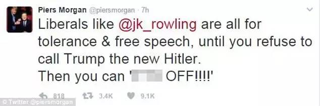 “以罗琳为代表的自由派一向推崇宽容和言论自由--直到你拒绝称呼特朗普为新时代希特勒,他们会叫你闭上嘴,滚你×的,”摩根发推回敬道,“我从来不看《哈利波特》是对的,它和它的作者一样,会致人脑残。”