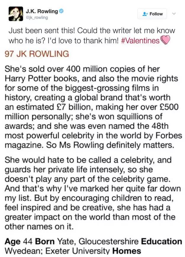 一天后的情人节,罗琳在推特上转了一篇赞美她的短文,“她卖出了4亿本小说,贡献了史上最高票房的系列电影,创造了一个价值70亿英镑的全球品牌,罗琳女士毫无疑问是个重量级人物。”
