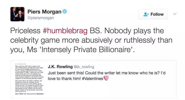 摩根于是发推鄙薄她的这一行为,“借别人的嘴巴自吹自擂,没有人比你更会沽名钓誉、玩名利游戏了,刻意保护私生活的亿万富翁女士。”