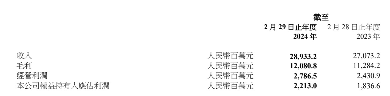 北京时间2024年5月22日晚间,运动零售商滔搏运动发布了公司2023/2024财年全年业绩公告。业绩报告显示,截至2月29日止年度,公司实现收入289.33亿元,同比增长6.87%;毛利120.81亿元,同比增长7.06%;经营利润27.87亿元,同比增长14.63%;公司权益持有人应占利润22.13亿元,同比增长20.49%;基本每股盈利35.69分。