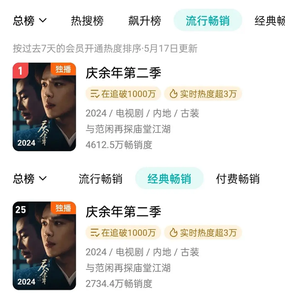 在流行畅销榜中,《庆余年2》排名第一,第二名则是第一季《庆余年》。