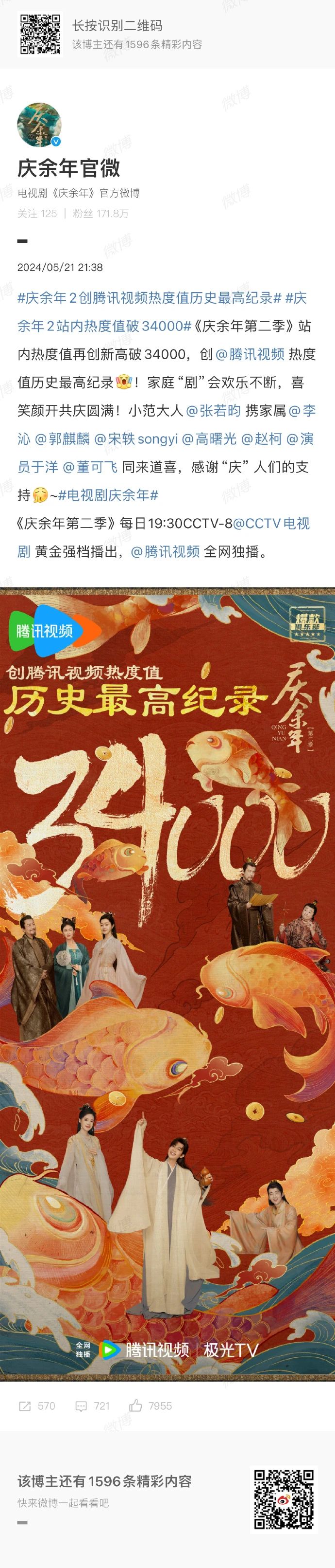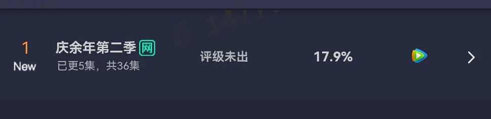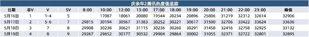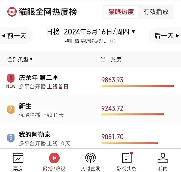 2024年5月16日,《庆余年2》在腾讯视频上线,开播首日热度值达32906,创开播首日最高热度值。