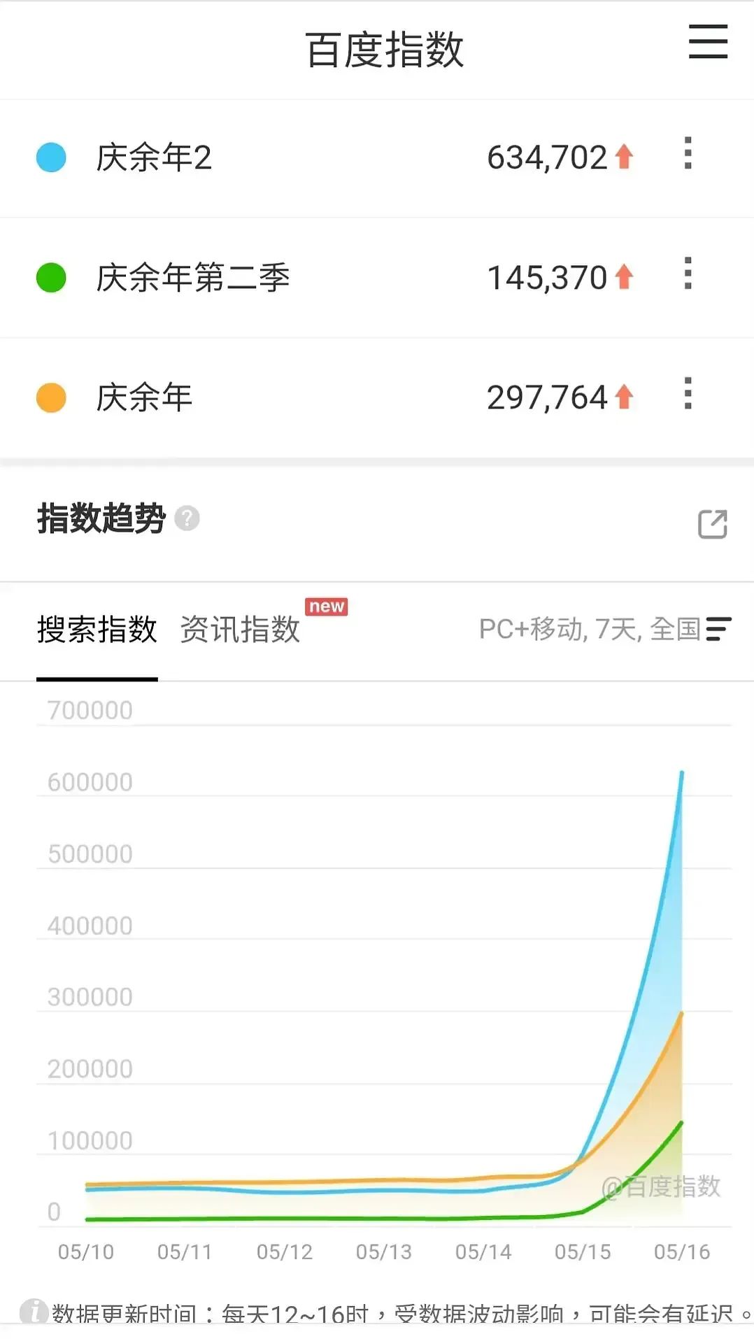 众人期待已久的《庆余年》续集5月16日在腾讯视频上线。这一天,《庆余年2》用了57分钟就冲破30000热度值,成为腾讯平台最快破3万的剧集。随后,热度还在不断攀升,一举突破34000,在腾讯视频热度史上再创新高。