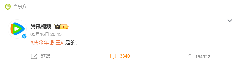 但是,《庆余年2》上线后的火爆程度大大超出了一般热播剧的范围。开播当天,微博词条“庆余年 剧王”挂爆标登顶热搜。在粉丝的期待中,腾讯视频官方微博出面大大方方地认领了词条。