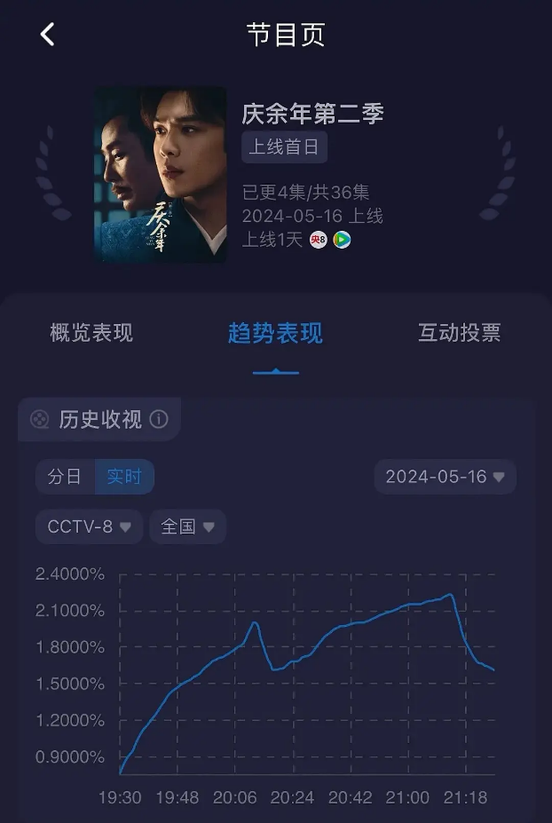 cvb指数方面,《庆余年2》开播首日收视率为1.314%,表现不俗。