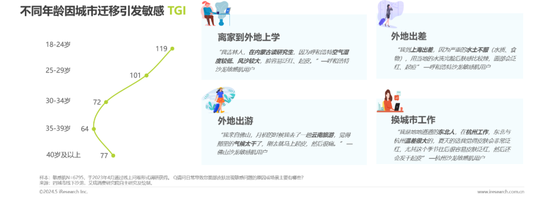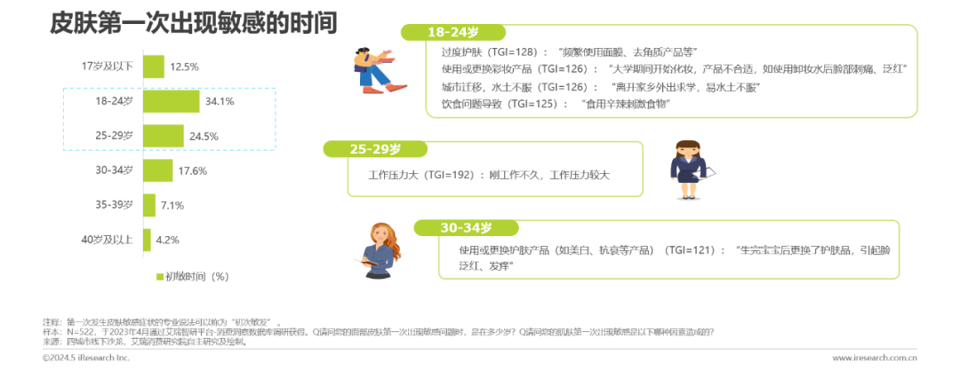 初次敏发在18-29岁的占比为58.6%,且18-24岁为占比最大年龄段,这个年龄段的敏感肌女性多处于学生时代或初入职场时期。