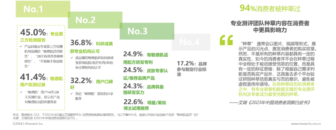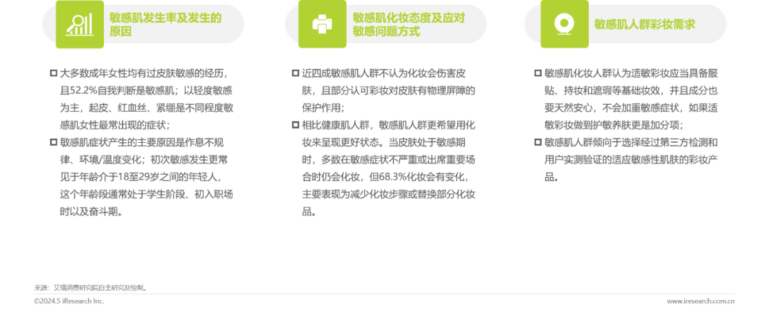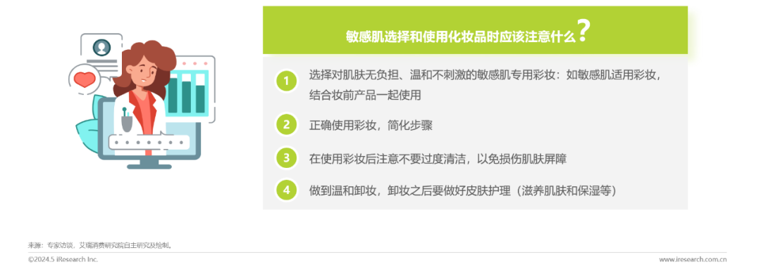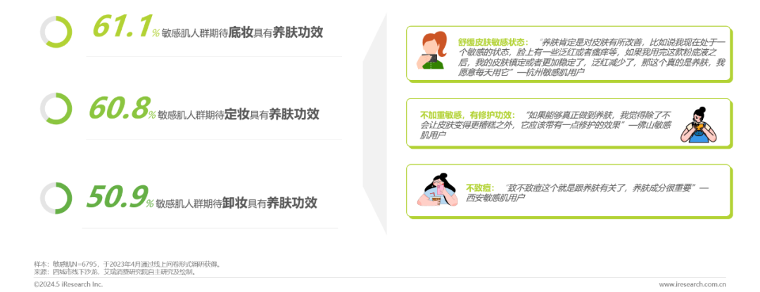 相比普通彩妆,敏感肌用户希望适用于敏感肌的彩妆能够修护敏感肤况、养肤以及纯净全绿配方,其次还要注意轻薄透气、不致敏、天然成分等。