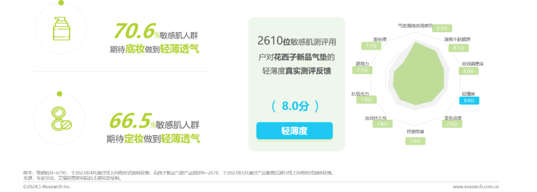 除服贴、持妆等基础妆效外,敏感肌人群更希望拥有一款轻薄透气、成分天然安心的底妆产品。