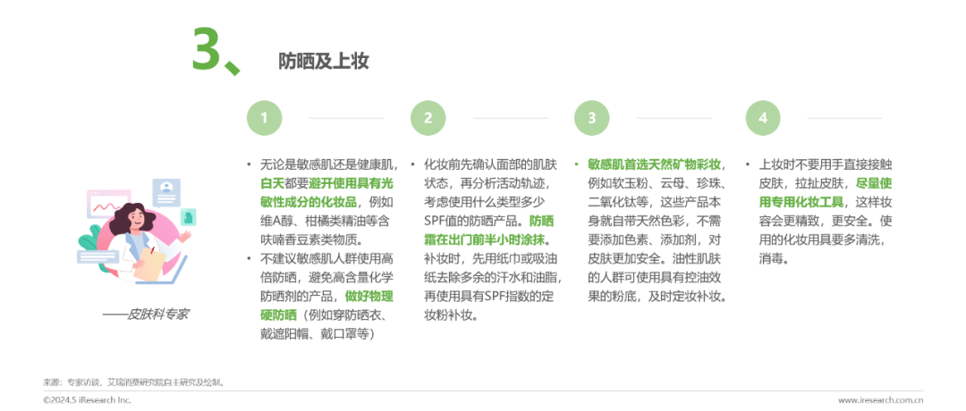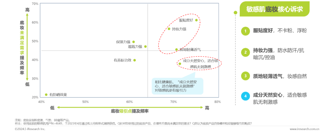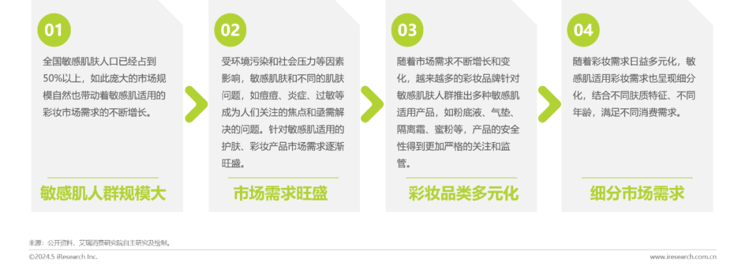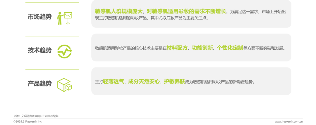 产品趋势:主打轻薄透气、成分天然安心、护敏养肤成为敏感肌适用彩妆产品的新消费趋势。