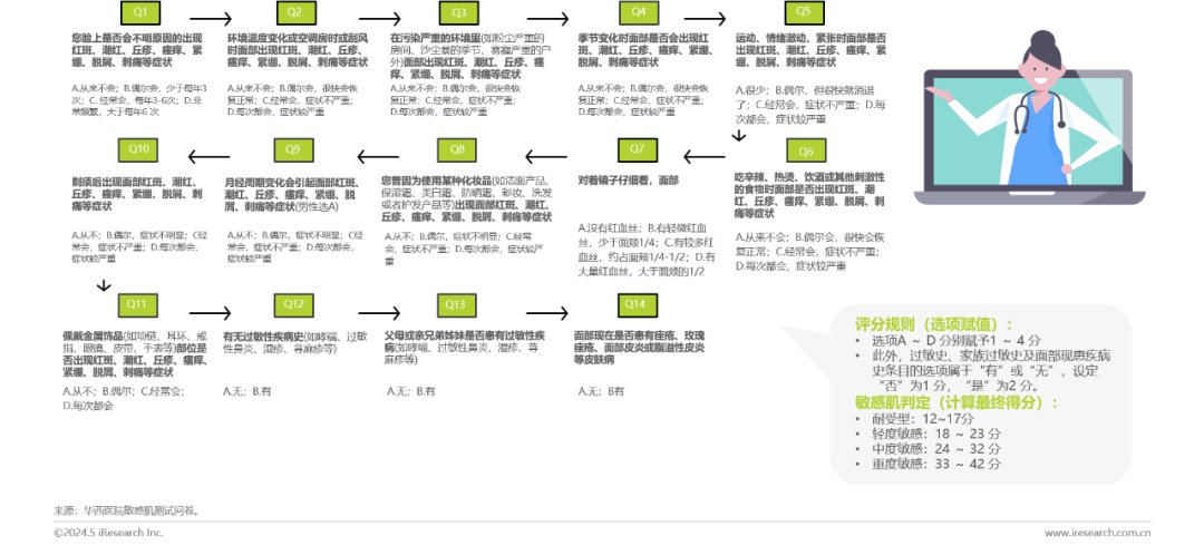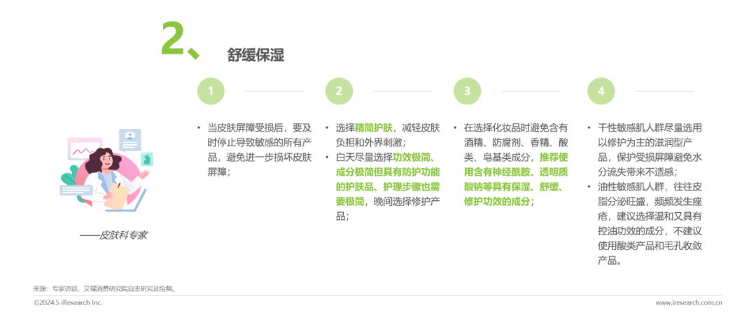 轻度敏感肌以简化步骤、分区护理或基础功效护肤等方式来实现皮肤自愈,而中重度敏感多就医解决。