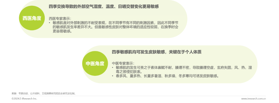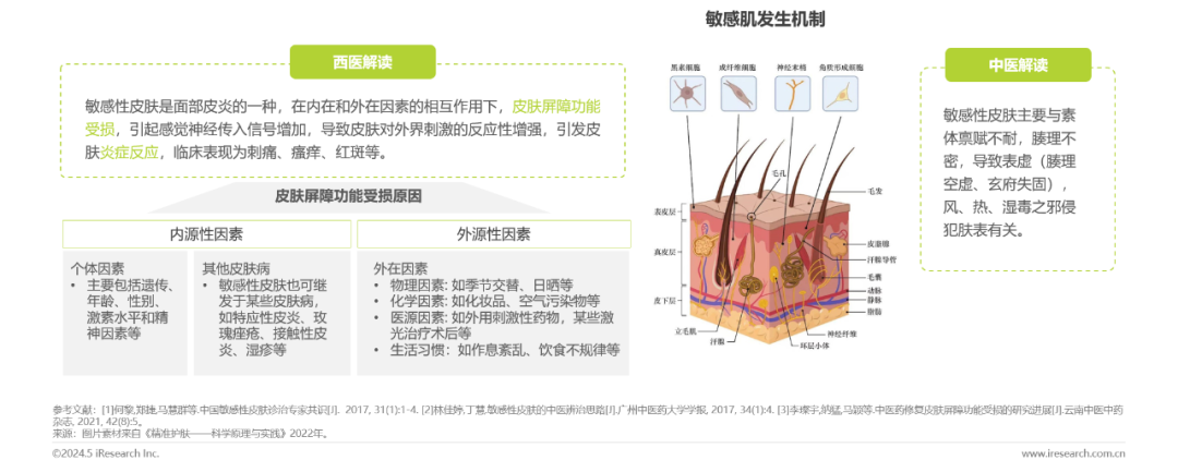 西医角度,敏感肌是在皮肤屏障功能受损后引起的皮肤炎症反应;中医角度,敏感性皮肤主要与表虚体质复感有关。