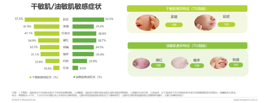 相对而言,干敏肌在紧绷、起皮上表现突出,油敏肌在潮红、瘙痒、刺痛上更显著。